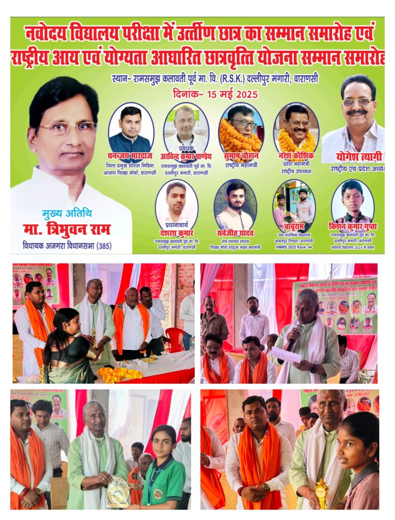 आर एस के पब्लिक स्कूल दल्लीपुर में नवोदय विद्यालय प्रवेश परीक्षा 2024 में चयनित किशन गुप्ता एवं राष्ट्रीय योग्यता आधारित परीक्षा में चयनित छात्र एवं आर एस के पब्लिक स्कूल के मेधावी छात्र छात्राओं को अजगरा विधायक माननीय त्रिभुवन राम द्वारा सम्मानित किया गया जिसमें आर एस के पब्लिक स्कूल मे समृद्धि पाण्डेय ने प्रथम स्थान प्राप्त कर विद्यालय का नाम रोशन किया | माननीय विधायक जी के साथ धनंजय भारद्वाज जिला प्रमुख सोशल मीडिया भाजपा पिछड़ा मोर्चा वाराणसी एवं सर्वजीत यादव क्षेत्र पंचायत सदस्य पिछड़ा मोर्चा हरहुआ मंडल महामंत्री एवं प्रबंधक अरविंद कुमार पाण्डेय प्रधानाध्यापक दशरथ कुमार एवं वरिष्ठ शिक्षक श्री जटाशंकर तिवारी सतीष कुमार शुक्ला एवं स्थानीय अभिभावक उपस्थित रहे। यह आयोजक आर एस के पब्लिक स्कूल दल्लीपुर एवं अखिल भारतीय जूनियर हाई स्कूल शिक्षक संघ द्वारा किया गया |