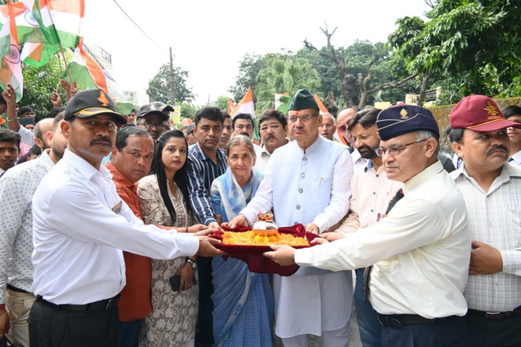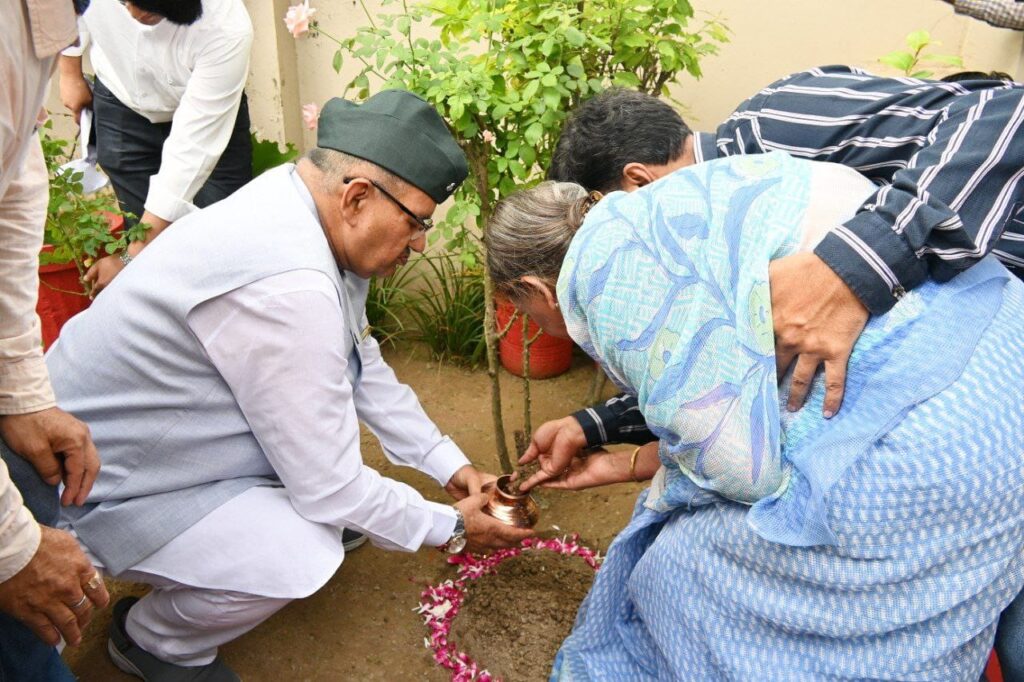 शहीद सम्मान यात्रा 2.0 के तहत शहीद लेफ्टिनेंट प्रतीक आचार्य के आंगन की मिट्टी का संग्रहण करते सैनिक कल्याण मंत्री गणेश जोशी