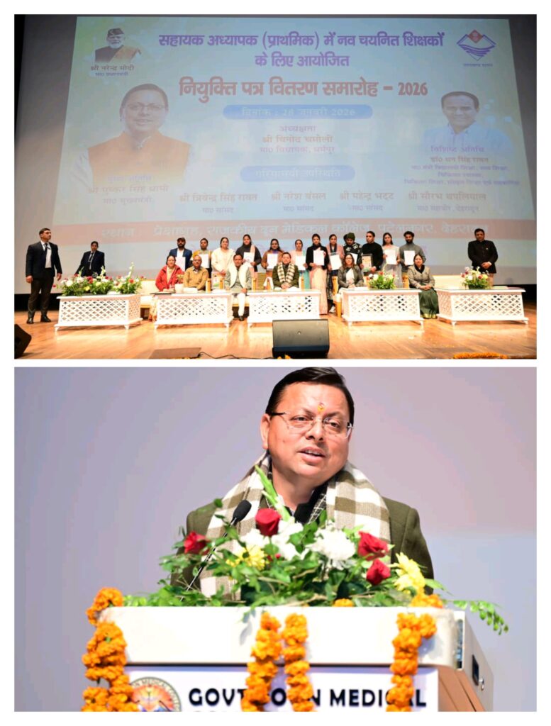 मुख्यमंत्री श्री पुष्कर सिंह धामी ने बुधवार को राजकीय दून मेडिकल कॉलेज, पटेलनगर, देहरादून में 1035 सहायक अध्यापक (प्राथमिक शिक्षा) को नियुक्ति पत्र प्रदान किए, जिनमें 17 विशेष शिक्षक भी शामिल हैं। मुख्यमंत्री ने सभी अभ्यर्थियों को शुभकामनाएं देते हुए आशा व्यक्त की कि सभी युवा शिक्षक राज्य में शिक्षा का स्तर बेहतर करने में महत्वपूर्ण भूमिका निभाएंगे। उन्होंने कहा कि आज से आपके कंधों पर उत्तराखंड के भविष्य को संवारने की महत्वपूर्ण जिम्मेदारी आ गई है। जब किसी बच्चे को गुणवत्तापूर्ण और संस्कारयुक्त शिक्षा मिलती है, तो वह केवल अपना जीवन ही नहीं संवारता, बल्कि समाज और राष्ट्र के निर्माण में भी अमूल्य योगदान देता है। शिक्षक देश के उज्ज्वल भविष्य के शिल्पकार हैं।_____मुख्यमंत्री ने कहा कि बच्चों को उत्कृष्ट शिक्षा देने के साथ-साथ उनमें समाज, संस्कृति और राष्ट्र के प्रति कर्तव्य की भावना भी विकसित करें, जिससे वे शिक्षा के साथ संस्कारवान और जिम्मेदार नागरिक भी बनें। उन्होंने कहा कि प्रधानमंत्री श्री नरेंद्र मोदी के मार्गदर्शन में राज्य सरकार प्रदेश की शिक्षा व्यवस्था को आधुनिक और गुणवत्तापूर्ण बनाने के लिए निरंतर कार्य कर रही है। विद्यालयों के आधारभूत ढांचे को सुदृढ़ करने से लेकर डिजिटल शिक्षा, शिक्षक प्रशिक्षण और कौशल विकास तक हर स्तर पर व्यापक सुधार किए जा रहे हैं।_____मुख्यमंत्री ने कहा कि राज्य में पिछले साढ़े चार वर्षों में 28 हजार से अधिक युवाओं को सरकारी नौकरी मिली है। यह केवल आंकड़ा नहीं, बल्कि हमारे युवाओं के आत्मसम्मान की जीत है। इन साढ़े चार वर्षों में जितनी नौकरियां युवाओं को मिली हैं, वह राज्य गठन के बाद और पूर्ववर्ती सरकारों के समय से दो गुना से भी अधिक है। उन्होंने कहा कि सरकार युवाओं के भविष्य से किसी को खिलवाड़ नहीं करने देगी।_____शिक्षा मंत्री डॉ. धन सिंह रावत ने कहा कि पिछले साढ़े चार साल में शिक्षा विभाग में 11 हजार 500 से अधिक नियुक्तियां प्रदान की गई हैं। 3 हजार 500 से अधिक विभिन्न पदों पर भर्ती प्रक्रिया गतिमान है। राज्य में शिक्षा में नवाचार पर विशेष ध्यान दिया जा रहा है।______इस अवसर पर शिक्षा महानिदेशक सुश्री दीप्ति सिंह, निदेशक माध्यमिक शिक्षा डॉ. मुकुल कुमार सती, निदेशक प्राथमिक शिक्षा श्री अजय नौडियाल, निदेशक अकादमिक शोध एवं प्रशिक्षण श्रीमती वंदना गर्ब्याल, अपर निदेशक श्रीमती कंचन देवराड़ी उपस्थित थे।